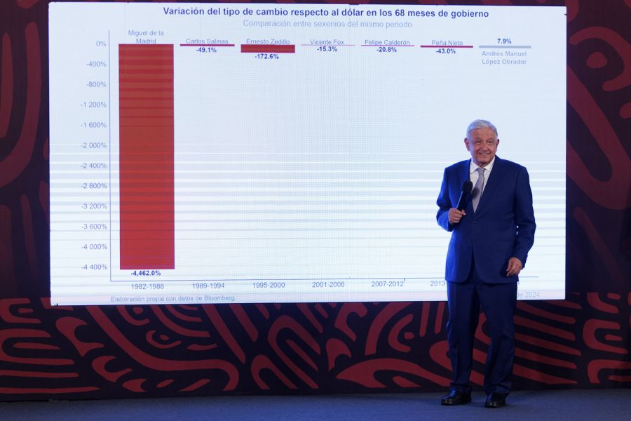 El mandatario recordó que en sexenios anteriores la moneda nacional enfrentó constantes devaluaciones. En la administración de Miguel de la Madrid (1982-1988) registró una apreciación de menos 4 mil 462 por ciento; en la de Carlos Salinas de Gortari (1988-1994), menos 49.1 por ciento; con Ernesto Zedillo (1994-2000), menos 172.6 por ciento; en la de Vicente Fox (2000-2006), menos 15.3 por ciento; en el periodo de Felipe Calderón (2006-2012), menos 20.8 por ciento y en el de Enrique Peña Nieto (2012-2018), menos 43 por ciento.