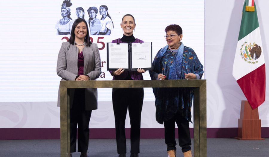 Al final de la conferencia matutina, la Presidenta de México firmó la iniciativa de reforma en compañía de la consejera jurídica del Ejecutivo Federal, Ernestina Godoy Ramos y la subsecretaria de Educación Básica, Angélica Noemí Juárez Pérez. (Rubén Vázquez Pérez)