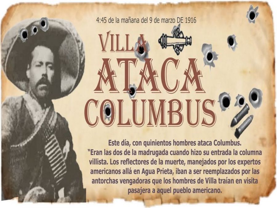 Así que en el amanecer del 9 de marzo de 1916, un grupo de 589 guerrilleros, incluyendo 16 vaqueros que fueron reclutados forzadamente cerca de Colina de Pacheco, atacaron el pueblo de Columbus, Nuevo México, en respuesta al reconocimiento oficial del régimen carrancista por parte de los Estados Unidos. Los invasores también buscaban a Samuel Ravel, un judío que junto con su hermano tenía dos hoteles, gracias a negocios anteriores con Villa, y dos tiendas en las cuales vendían armas, entre otros objetos, que había defraudado a los villistas que trataban de comprarle armas para seguir en la lucha contra los carrancistas. Además, Villa pretendía robar el banco local y hacerse de municiones. En la acción, los invasores sólo atacaron a civiles que les disparaban y a la guarnición militar que defendía el pueblo.